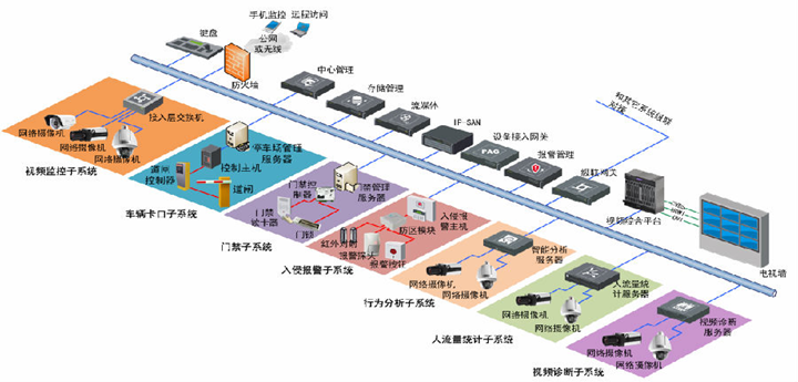 整个系统设计包括:视频监控系统、入侵报警系统、门禁管理系统、出入口控制系统、行为分析系统、人流量统计系统、视频质量诊断系统,系统拓扑结构如下图所示: